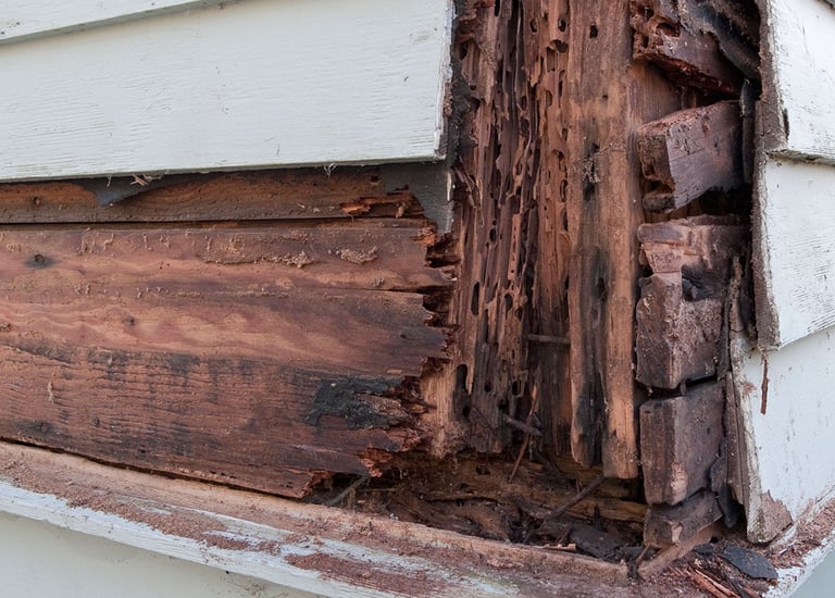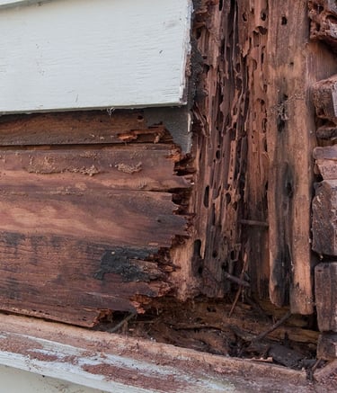 Borer holes and rot in structural timber — untreated wood weakened by moisture and insects. Pre-purchase checks prevent buyers from inheriting expensive remediation costs.