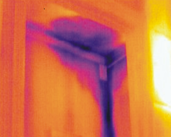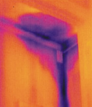 Thermal scan detecting hidden moisture behind the wall and door The cooler purple/blue patch reveals trapped water that could lead to thousands in rot, mold, or structural repairs if missed. Caught non-invasively with infrared during a pre-purchase inspection — peace of mind that saves real money.