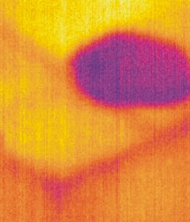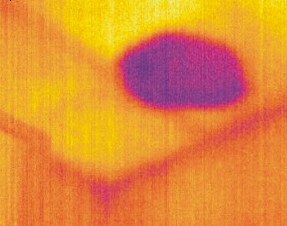 Thermal imaging revealing a hidden moisture leak — the cooler purple/blue area shows water trapped behind the ceiling, often invisible to the naked eye. Detected non-invasively during a pre-purchase inspection.
