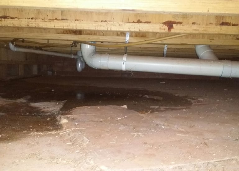 Visible plumbing leak in crawl space — water pooling on ground, threatening timber and insulation. We catch these hidden hazards to prevent expensive surprises.